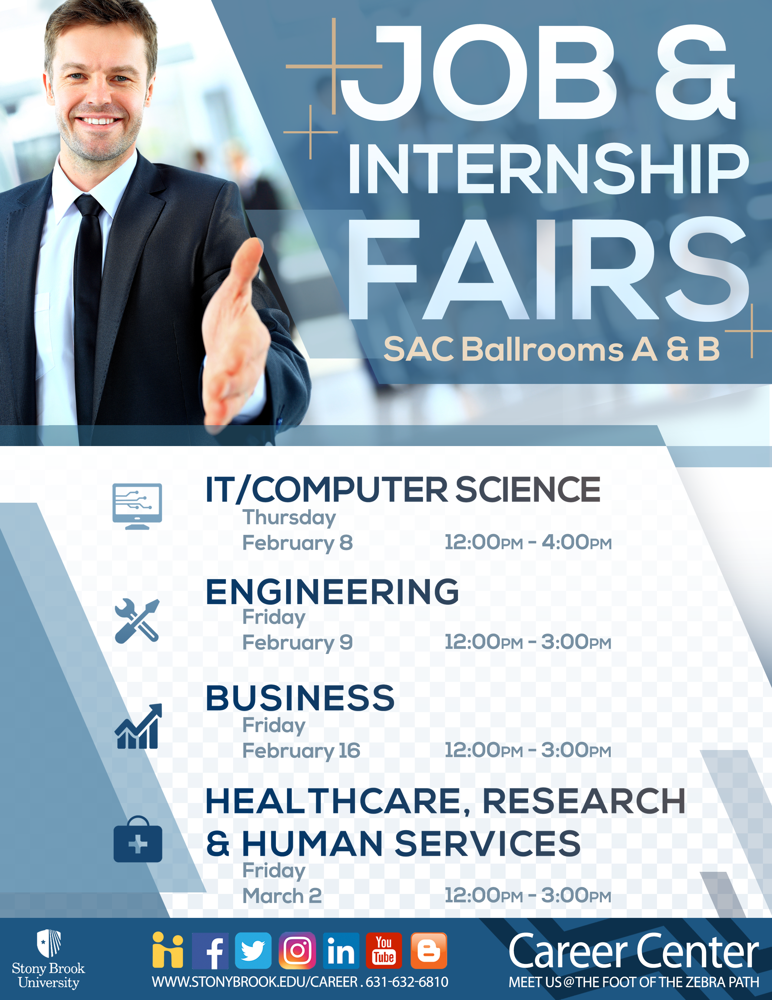 • FIVE Job Fairs and Recruiting Events this Semester - You read that right. This spring you can participate in five recruiting events plus all of the pre-events which include company information sessions. The CS/IT Job and Internship Fair kicks off Stony Brook’s spring semester recruiting on February 8 from 12-4p. The morning of the job fair, you are invited to join the Stony Brook Computing Society and Women in Computer Science (WiCS) for a networking mixer. Check out the employers who are attending the job fair here by logging in to Handshake. The important things to do before the job fair are to practice your “pitch”, make sure your resume is current and engaging, and research the companies that interest you. Can’t make February 8th? On February 9 you can attend the Engineering Job and Internship Fair.