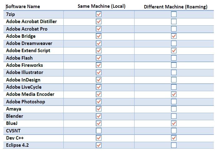The chart below can be used to determine which settings will travel with me in different scenarios within the teaching labs. The first column records the name of the software tested, the second and third columns indicate whether settings persisted after returning to the same machine, or a different machine respectively. A checked box indicates that in our testing settings within a program transferred while and empty box indicates the opposite. In the event you find any information missing or inaccurate please contact the Systems Staff at rt [at] cs.stonybrook.edu, and we can investigate the issue further or clarify any needed information.