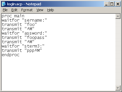 Download the login.scp file and store it in a suitable location such as c:\windows\system32\ras. Edit the file to store your login information. Suppose my username and password are "foo" and "foopass" respectively, my file will look like