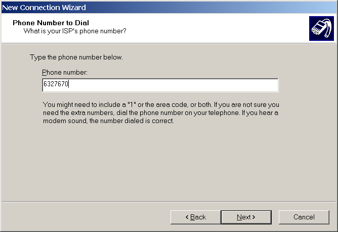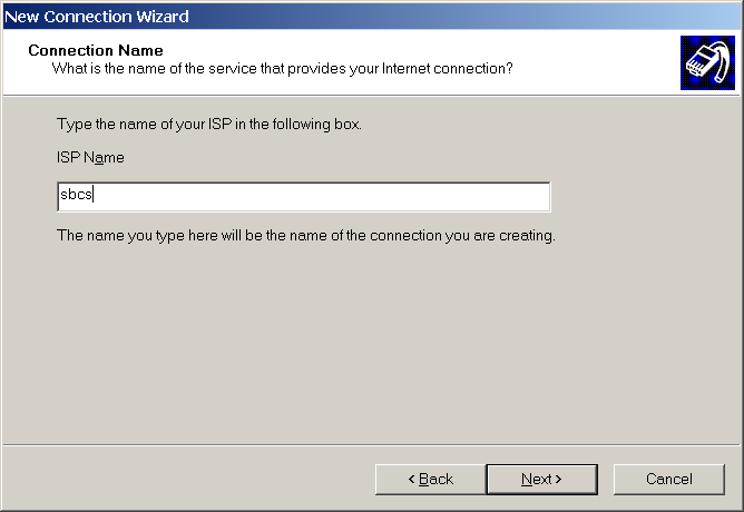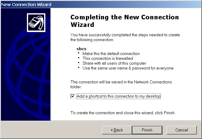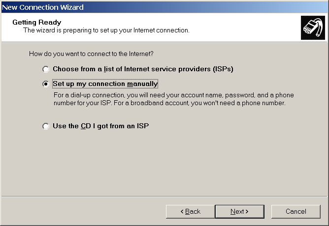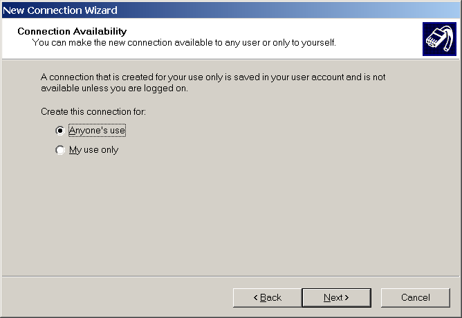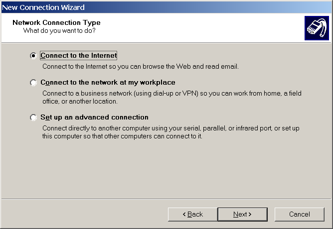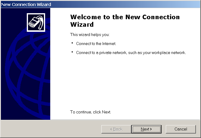 Open Windows Explorer. Under the Control Panel submenu (click on the "plus" sign next to Control Panel), click on "Network Connections". Click on File->New Connection. - This will start the New Connection Wizard as shown below. Click "Next"
