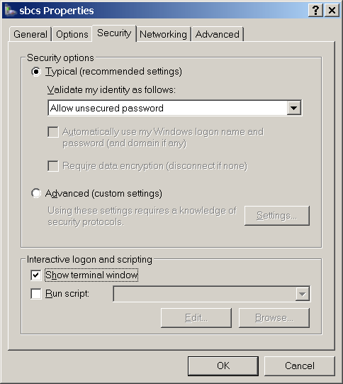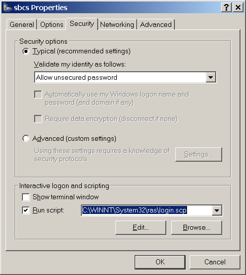 Download the login.scp file and store it in a suitable location such as c:\windows\system32\ras. Edit the file to store your login information. Suppose my username and password are "foo" and "foopass" respectively, my file will look likeThen on the Security subwindow on the connection properties, select the "Run Script" option and from the drop down list, select your login script as shown. Click "Ok".