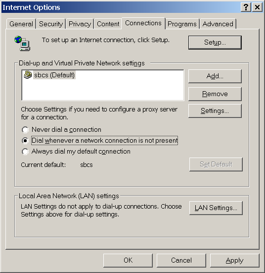 - Click on the Connections subwindow, and select "Dial whenever a network connection is not present". This will prevent Windows from dialing when you are connected to LAN or wireless.