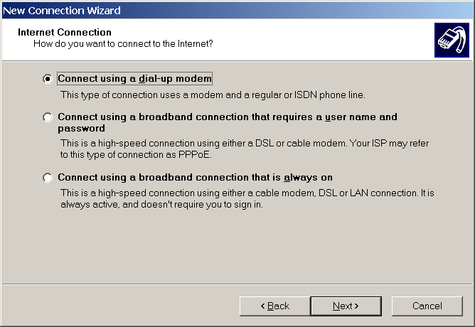 - Select "Connect Using a Dialup Modem" and click "Next".