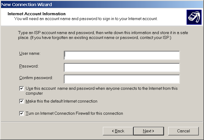 - You can skip the username and password on the next screen. This is not transmitted to the dialup server. However, you can disable the personal firewall for this connection option (not recommended). Click "Next".